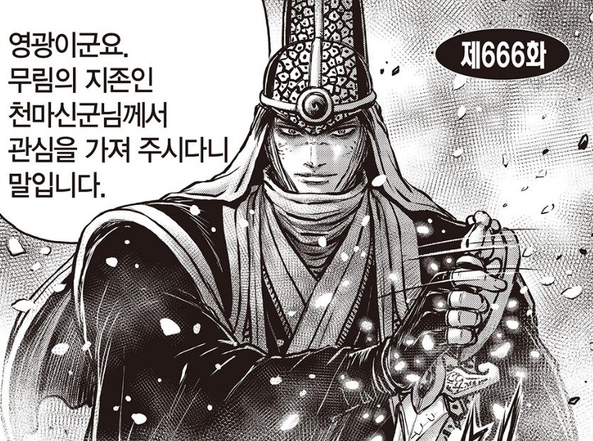 열혈강호 666화가 업데이트되었다. 천신각주 사음민은 신지 검종의 정통 후예로서 부끄럽지 않은 실력을 보여주었으나 자하마신, 묵령, 갈뢰 등 천하오절급의 고수들에게는 상대가 되지 않았다. 결국 자하마신에 의해 심검이 박힌 후 꼭두각시 노릇을 하고 있는 상황에서 마령검(복마화령검)에 의해 언제든지 죽을 위기에 처해있어 생존을 위해 유리한 선택을 해나가고 있다.